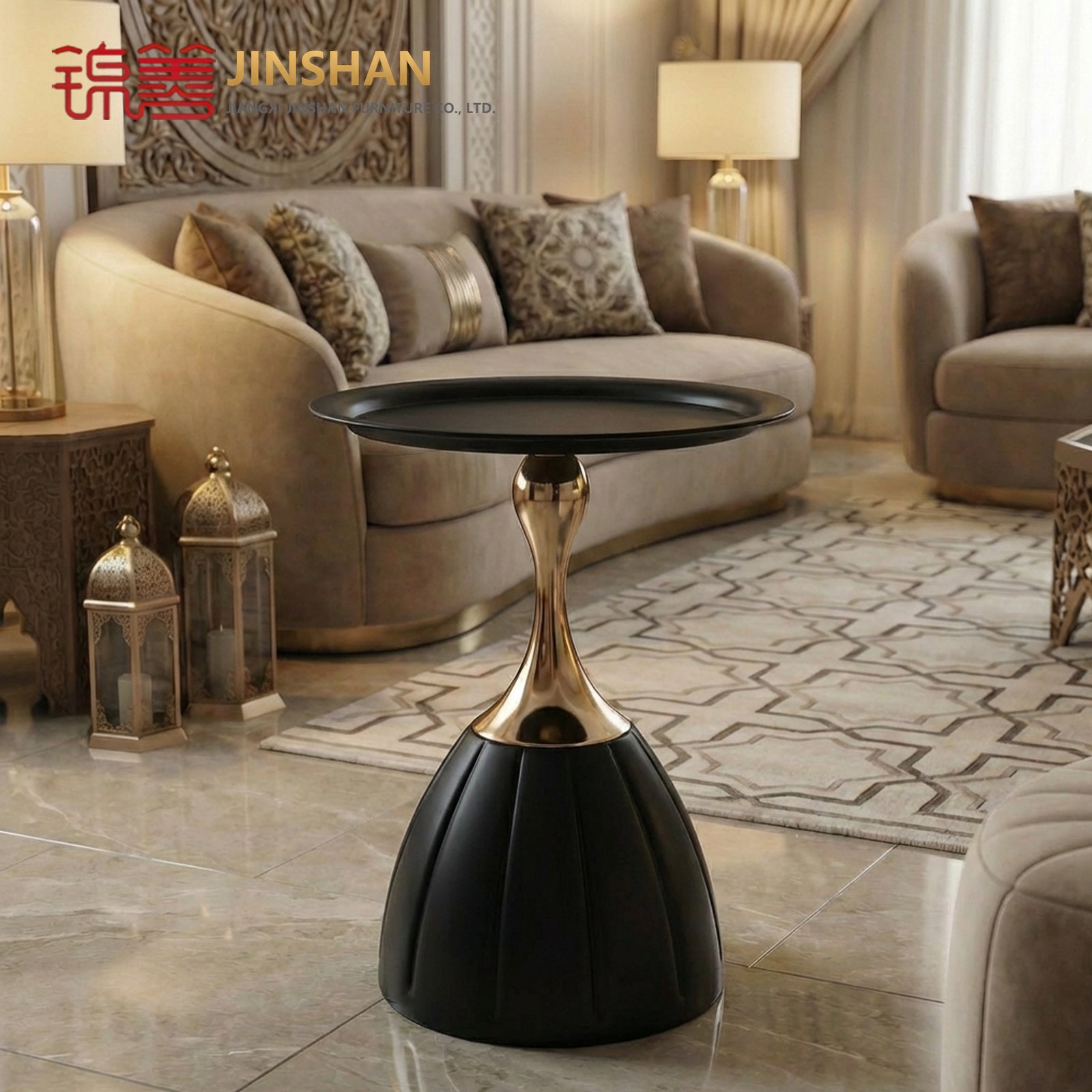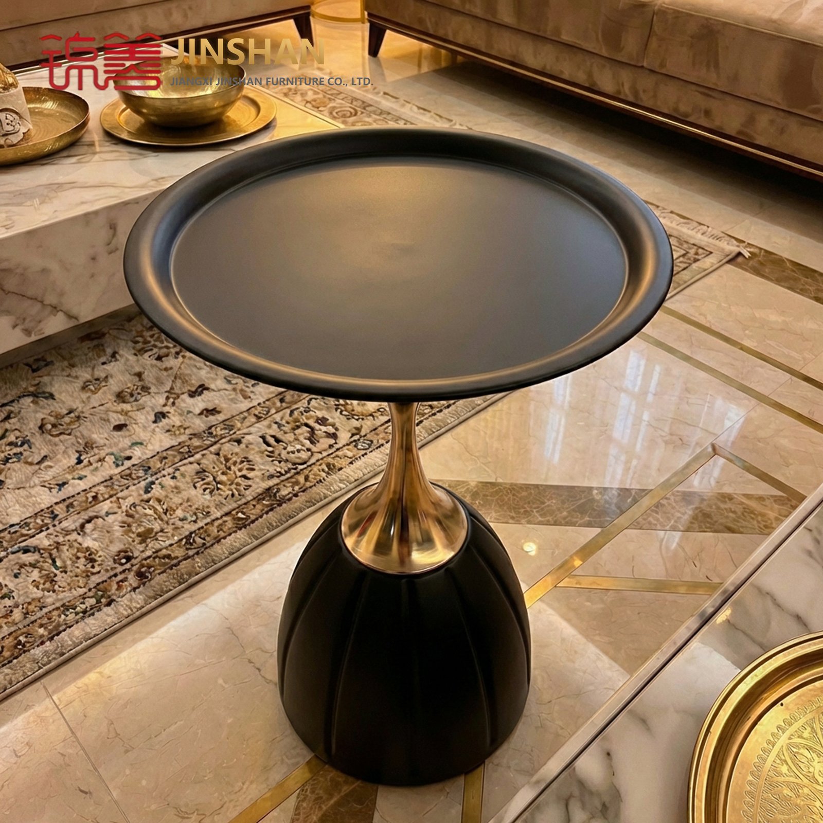 Luxury Black Matte Coffee Table with Golden Accent Modern Round Tray Design, Elegant Living Room Décor